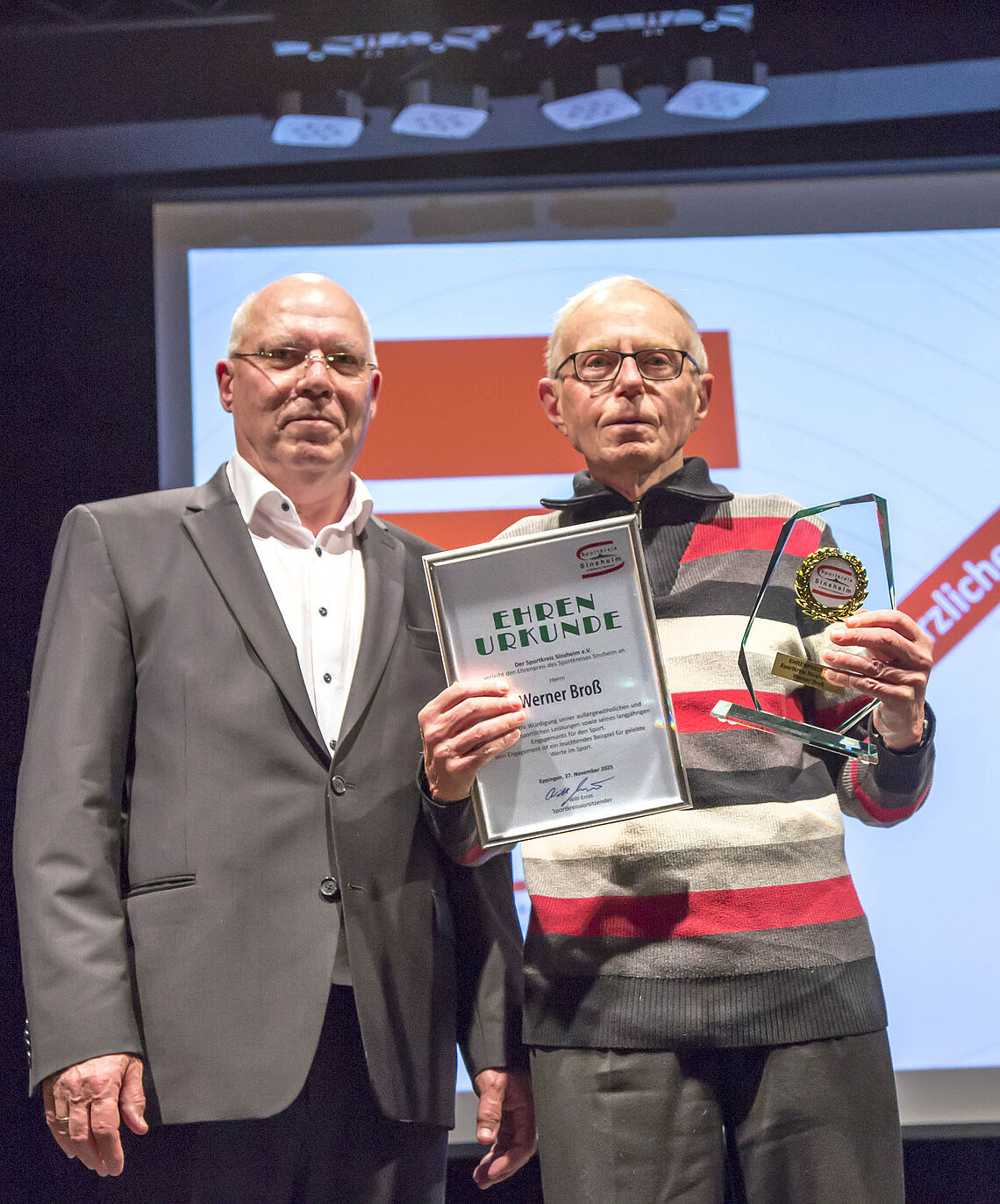 Eine ganze besondere Ehrung ging mit dem ersten Ehrenpreis des Sportkreises Sinsheim für seine besondere Leistung an den Gemminger Werner Broß. Der heute 86-jährige Leichtathlet hält weiterhin zehn badische Rekorde in den Disziplinen 400-Meter bis zum Marathon und treibt auch weiterhin viel Sport, wie er bei seiner für ihn überraschenden Ehrung erzählte. Wöchentlich läuft er 100 km um weiterhin fit zu bleiben und ist damit noch lange nicht am Ziel angekommen. Im kommenden Jahr möchte er am 25. Heilbronner Marathon an den Start gehen.